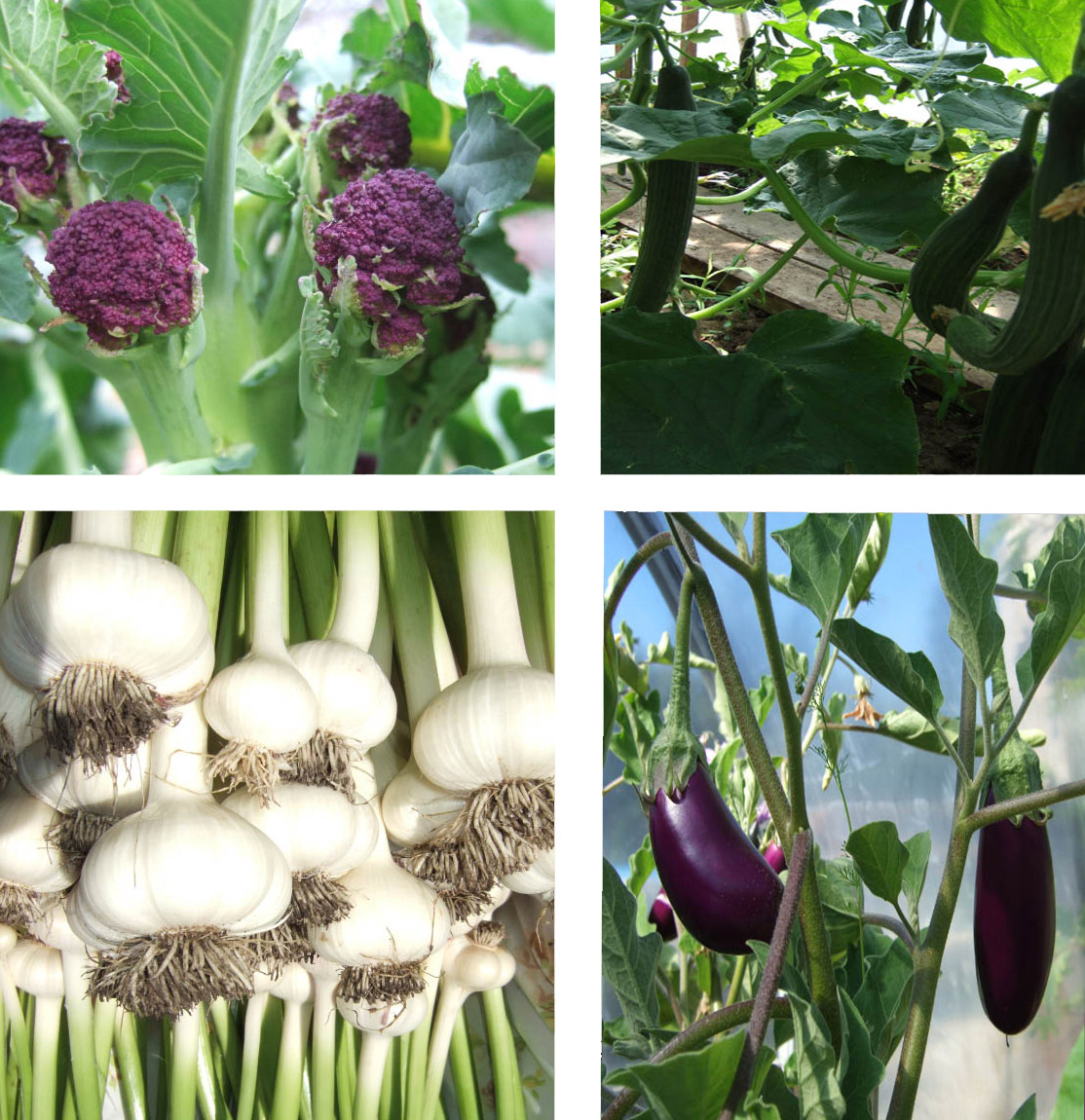 Purple Sprouting Broccoli, Carmen Cucumbers, Red Russian Garlic, Galine Eggplants Grown in Gidora's Garden
