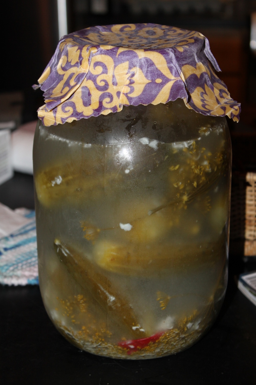 Put all the ingredients into the jar with the cucumbers and some of the dill on top. Cover with a brine solution of 1 tablespoon of coarse sea salt to 1 cup of water. Make enough brine to cover the cucumbers. Put a smaller jar or zip-lock bag filled with water on top to keep the cukes submerged. Store in a warm place and let ferment for 1 to 2 weeks. Check after one week to see if they are sour enough for you. The warmer the location, the faster they will ferment. Refrigerate when done.