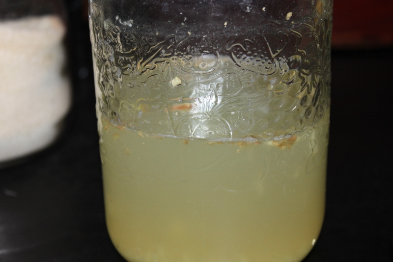 Stir in 1 tsp. ginger and 1 tsp. sugar and let sit 1 day. Repeat twice more. Mixture (ginger bug) should have bubbles throughout and release more when agitated.